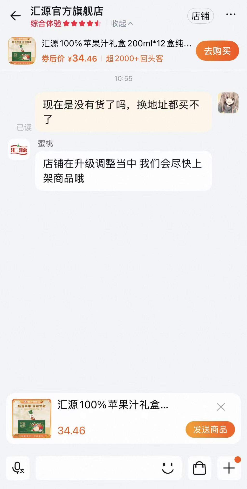 对于汇源在声明中提到的各大电商平台出现大面积断货的情况。澎湃新闻在其淘宝官方旗舰店“汇源官方旗舰店”搜寻后发现,目前店铺显示仅有两款产品可售,但更换多个地址均显示“此商品不支持在当前地区销售”,客服表示,“店铺在升级调整中,会尽快上架商品。”